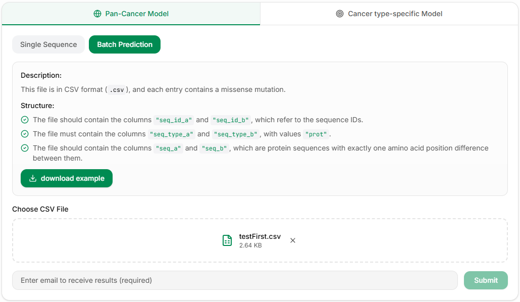 In the Pan-Cancer Prediction Model section, click Batch Prediction, upload a CSV file that strictly follows the above requirements, and enter your email to receive the processed results.
