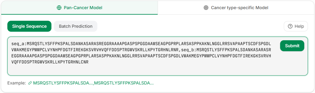In the Pan-Cancer Prediction Model section, click Single Sequence Prediction, enter the wild-type and mutant protein sequences in the input box, then click Submit and wait for the results to appear.