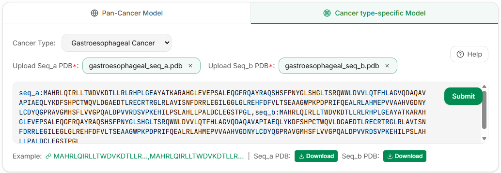 In the Cancer type-specific Prediction Model section, click the dropdown menu to select a specific cancer type, enter the wild-type and mutant protein sequences and upload the corresponding PDB files, then click Submit and wait for the results to appear.